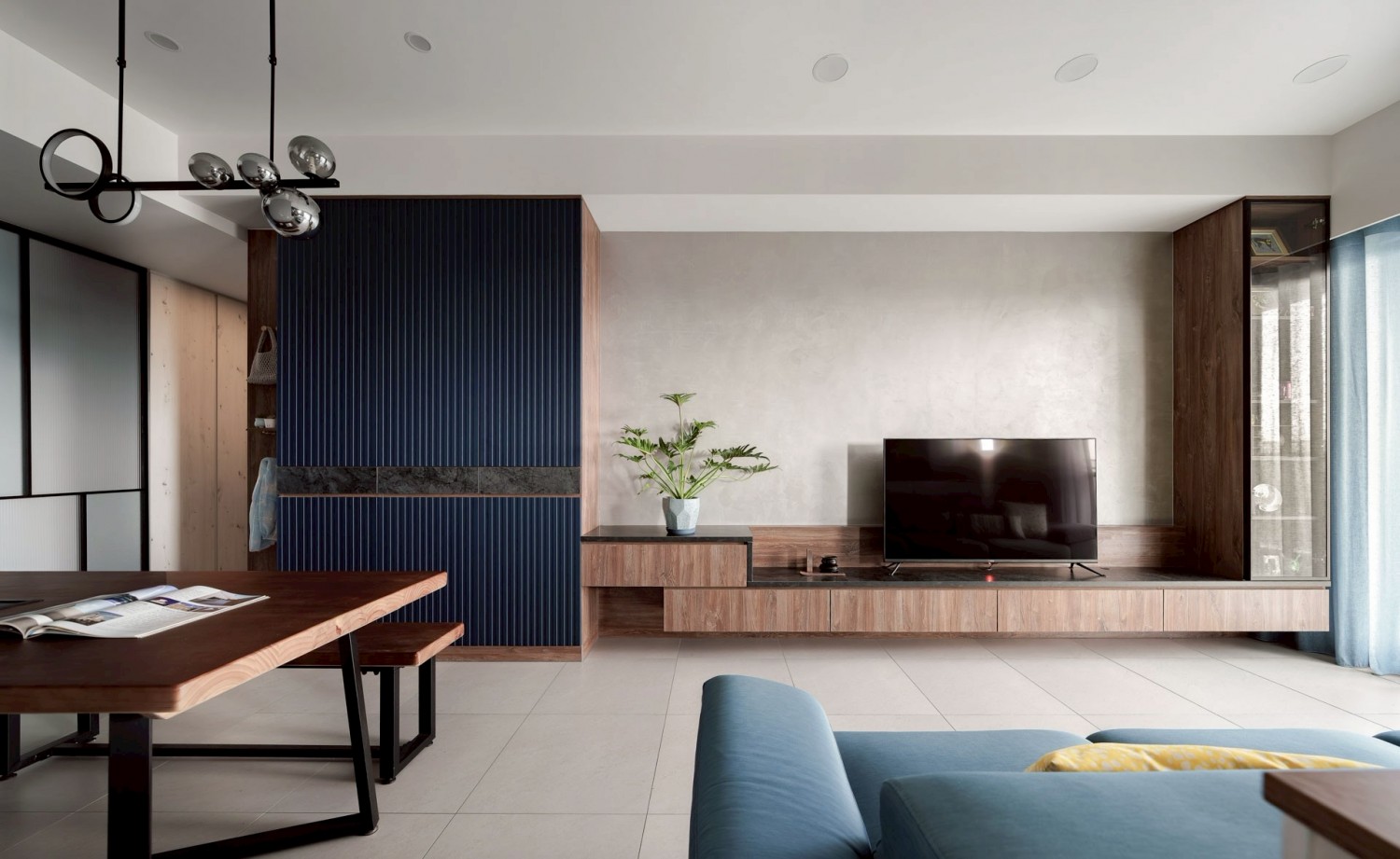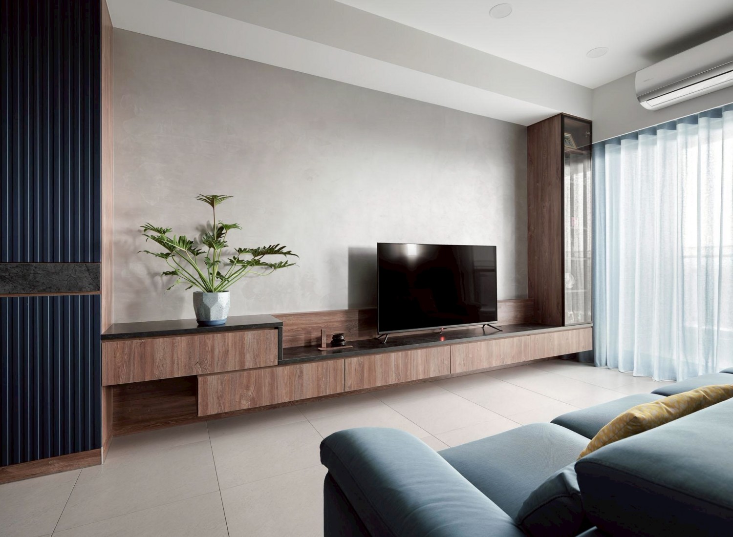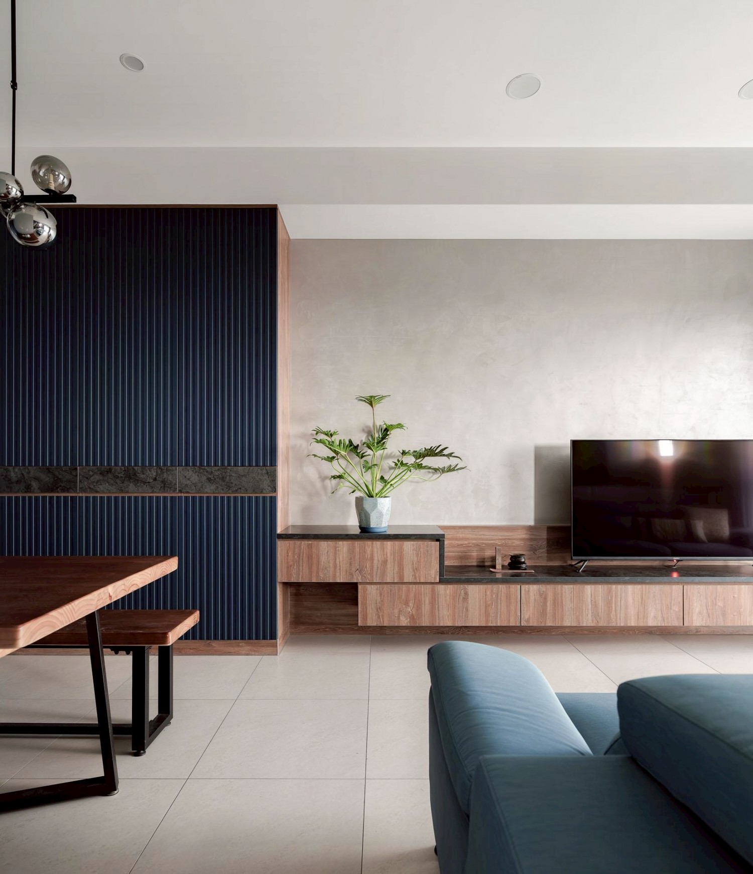 深藍立面作為視覺錨點,搭配灰泥牆與懸浮式電視櫃,營造沉穩、安定又耐看的客廳主視覺。