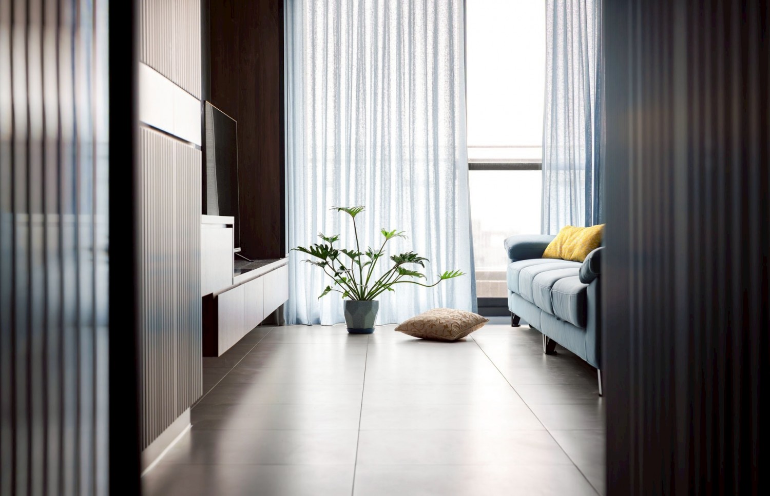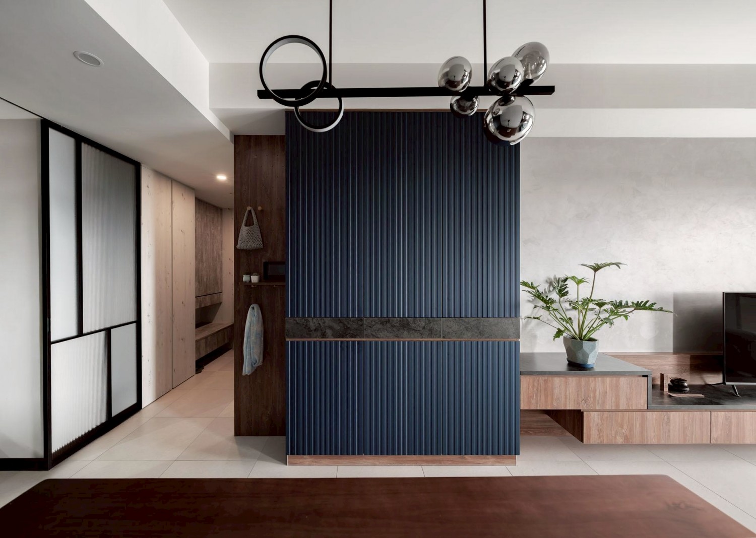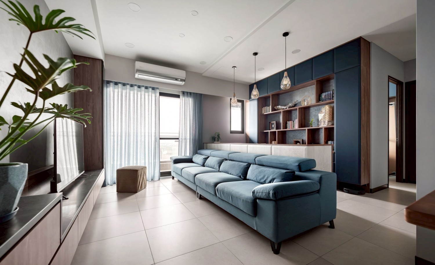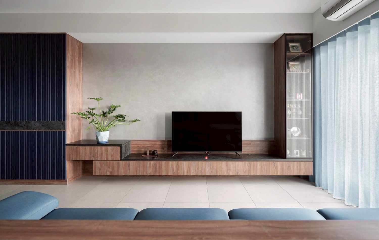 深藍立面作為視覺錨點,搭配灰泥牆與懸浮式電視櫃,營造沉穩、安定又耐看的客廳主視覺。