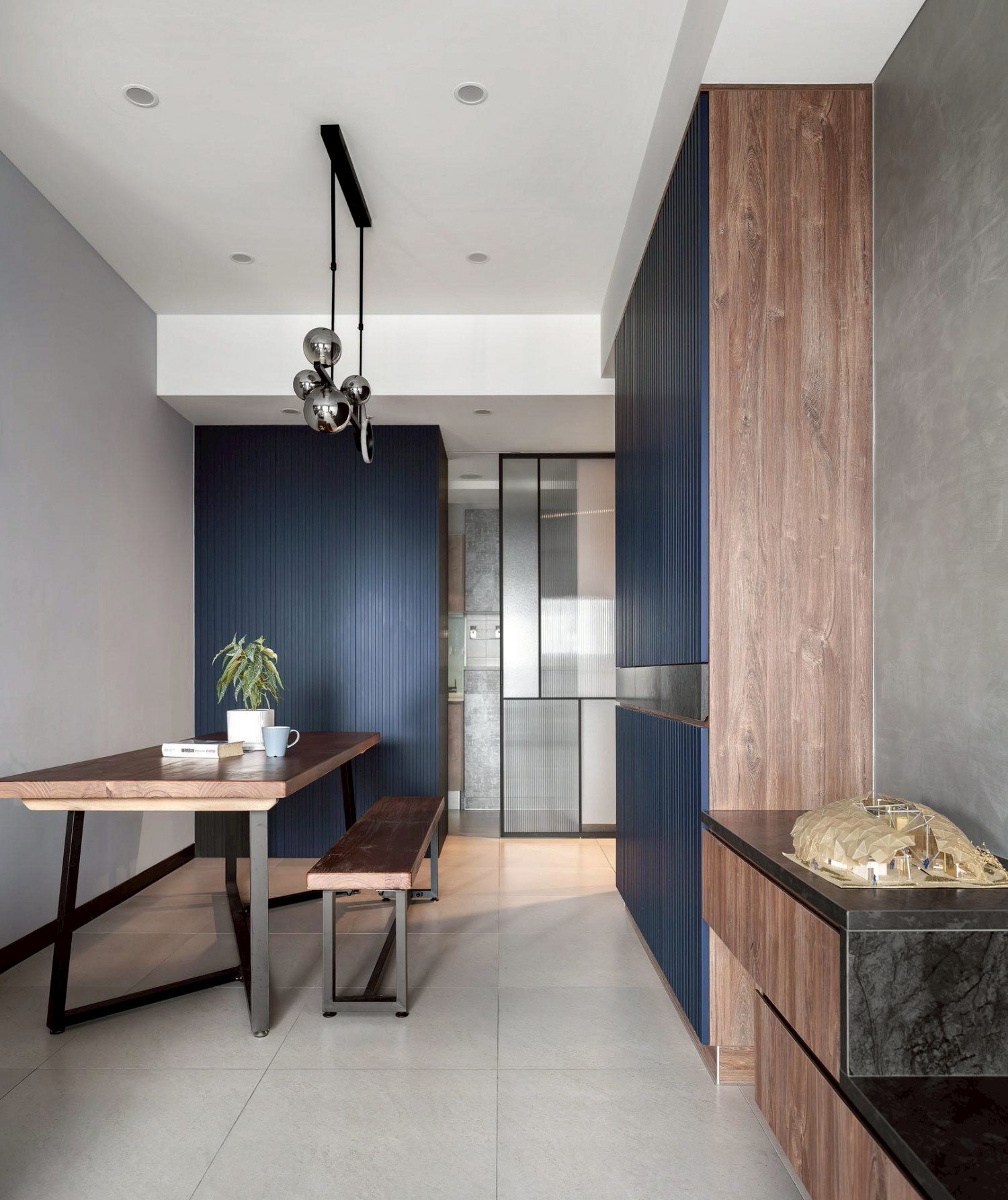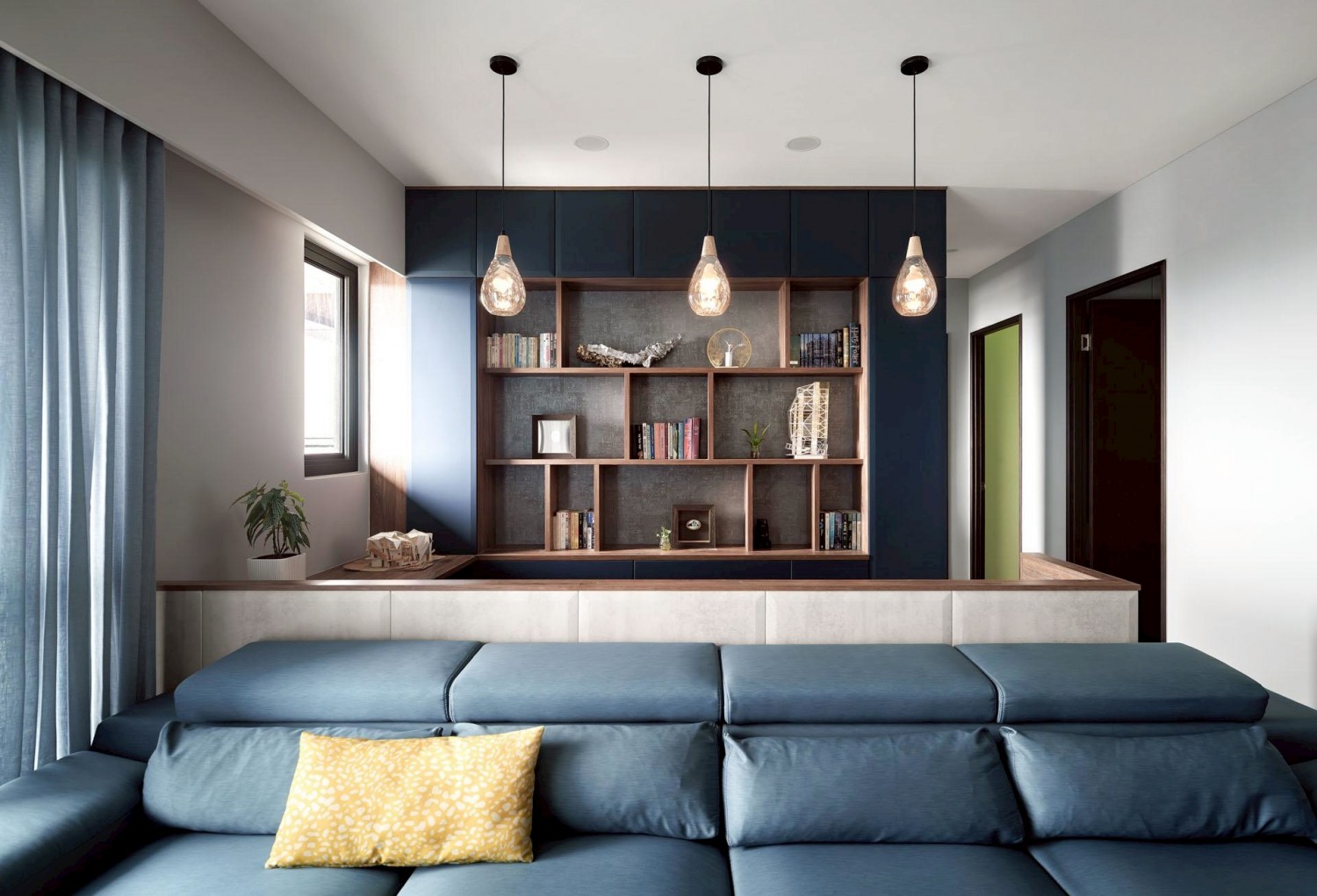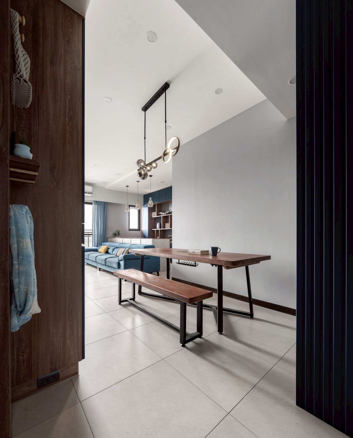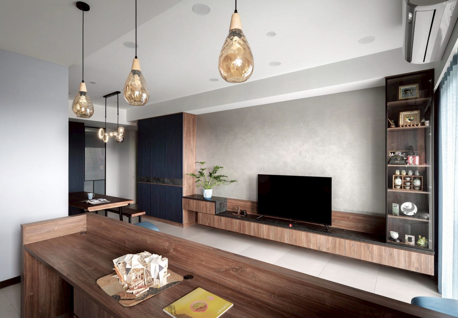 後方書牆利用深藍色系搭配木格架設計,增添空間層次與人文氣息,並透過吊燈點綴,形成視覺焦點。