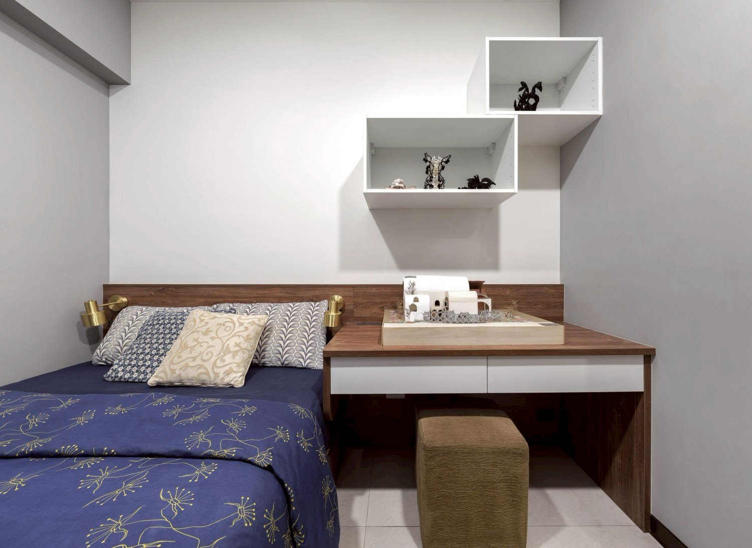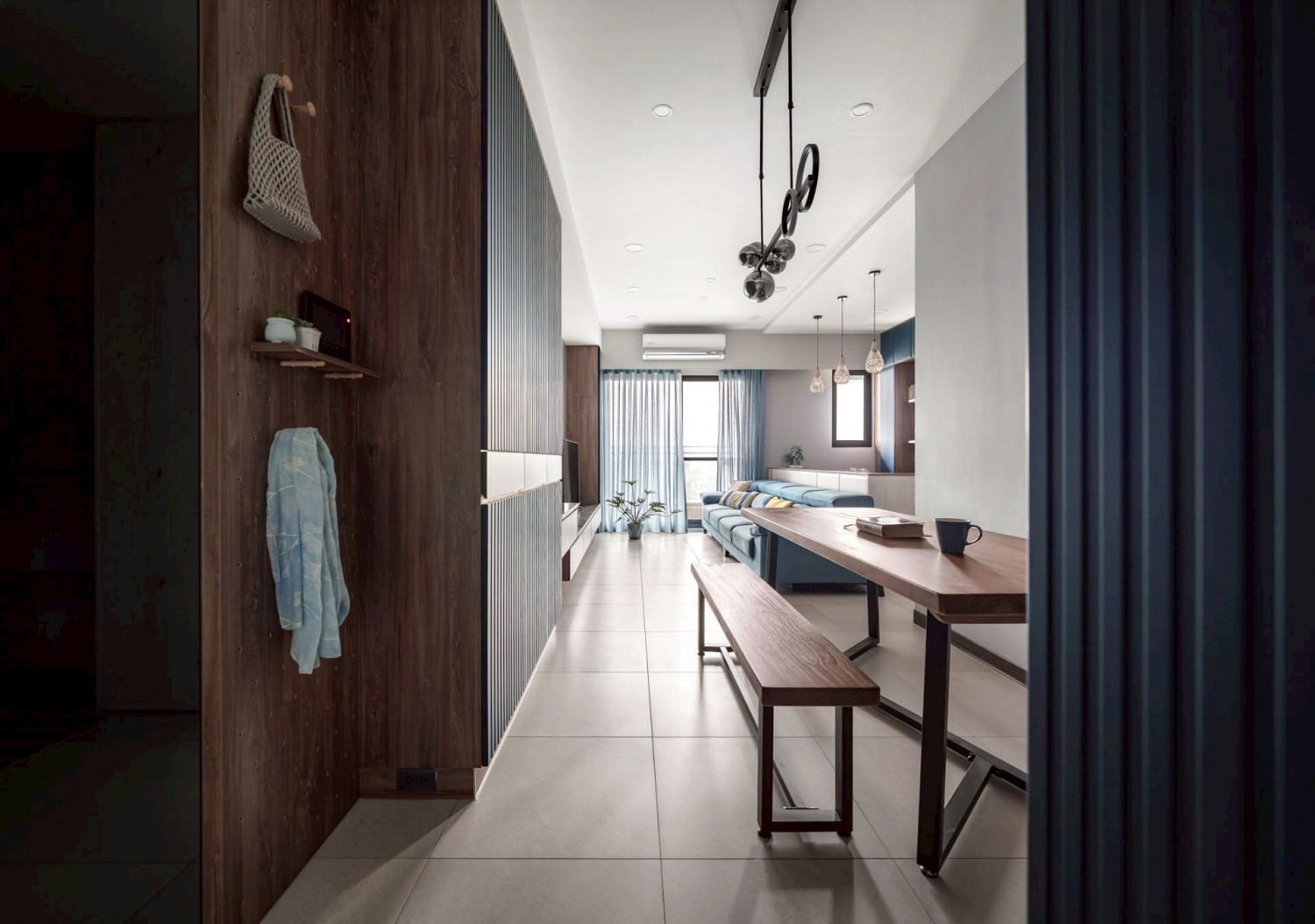 利用色彩對比(木質 × 藍色)創造空間記憶點