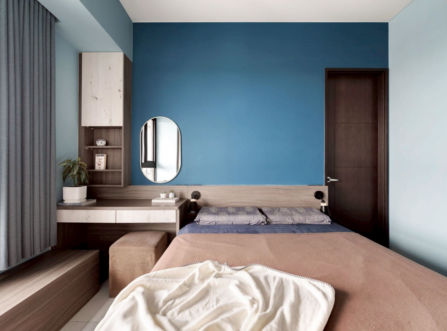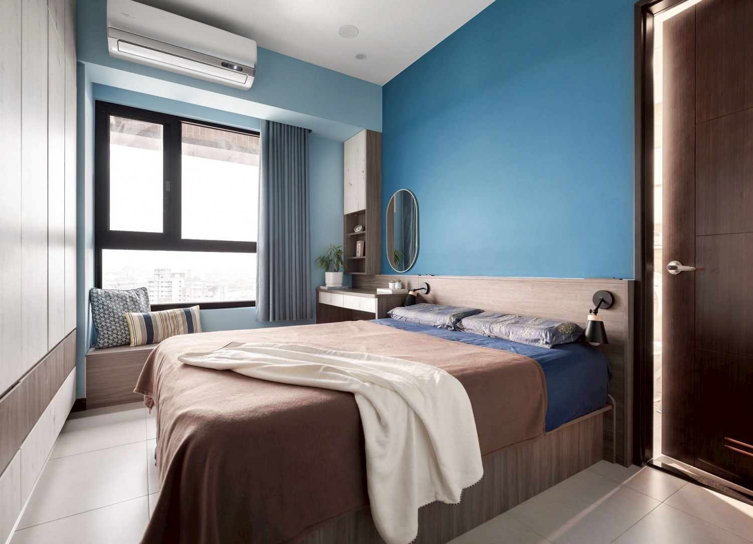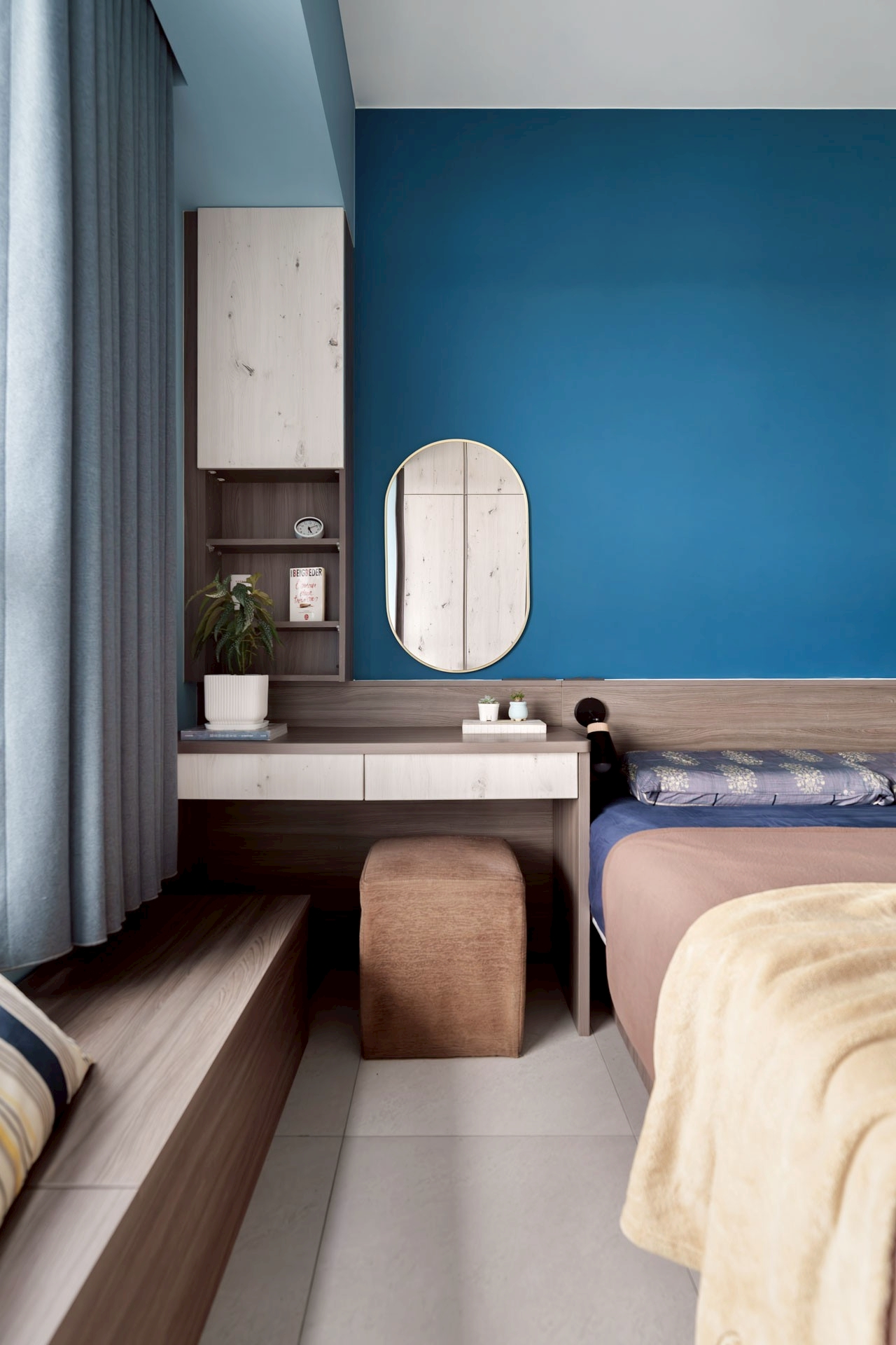 臥室延續整體風格,以藍色主牆搭配木質床架與系統櫃,營造安定且放鬆的休憩氛圍;大面採光窗搭配柔和窗簾,使自然光均勻灑落,提升空間舒適度與生