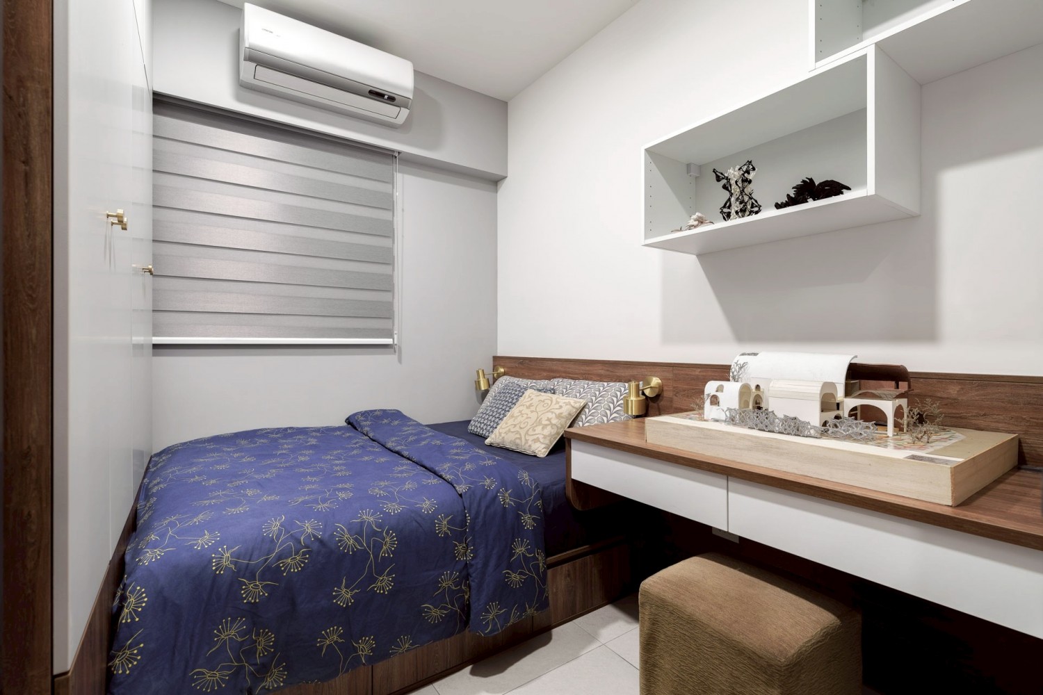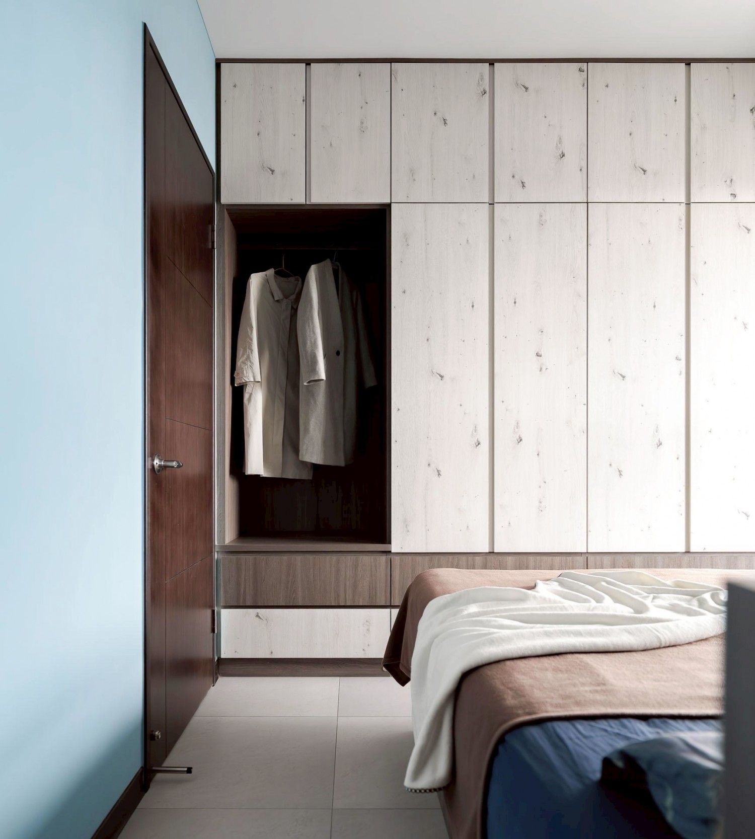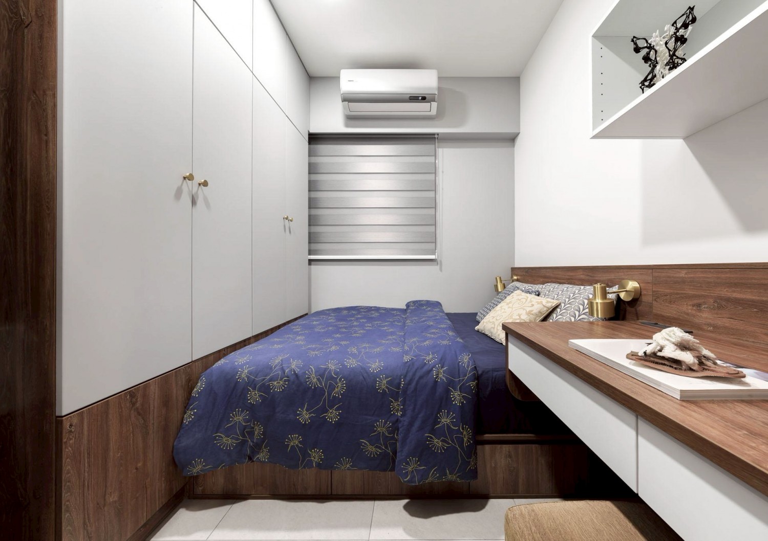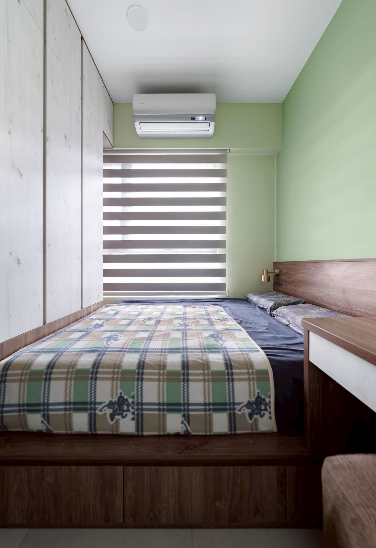 臥室延續整體風格,以藍色主牆搭配木質床架與系統櫃,營造安定且放鬆的休憩氛圍;大面採光窗搭配柔和窗簾,使自然光均勻灑落,提升空間舒適度與生