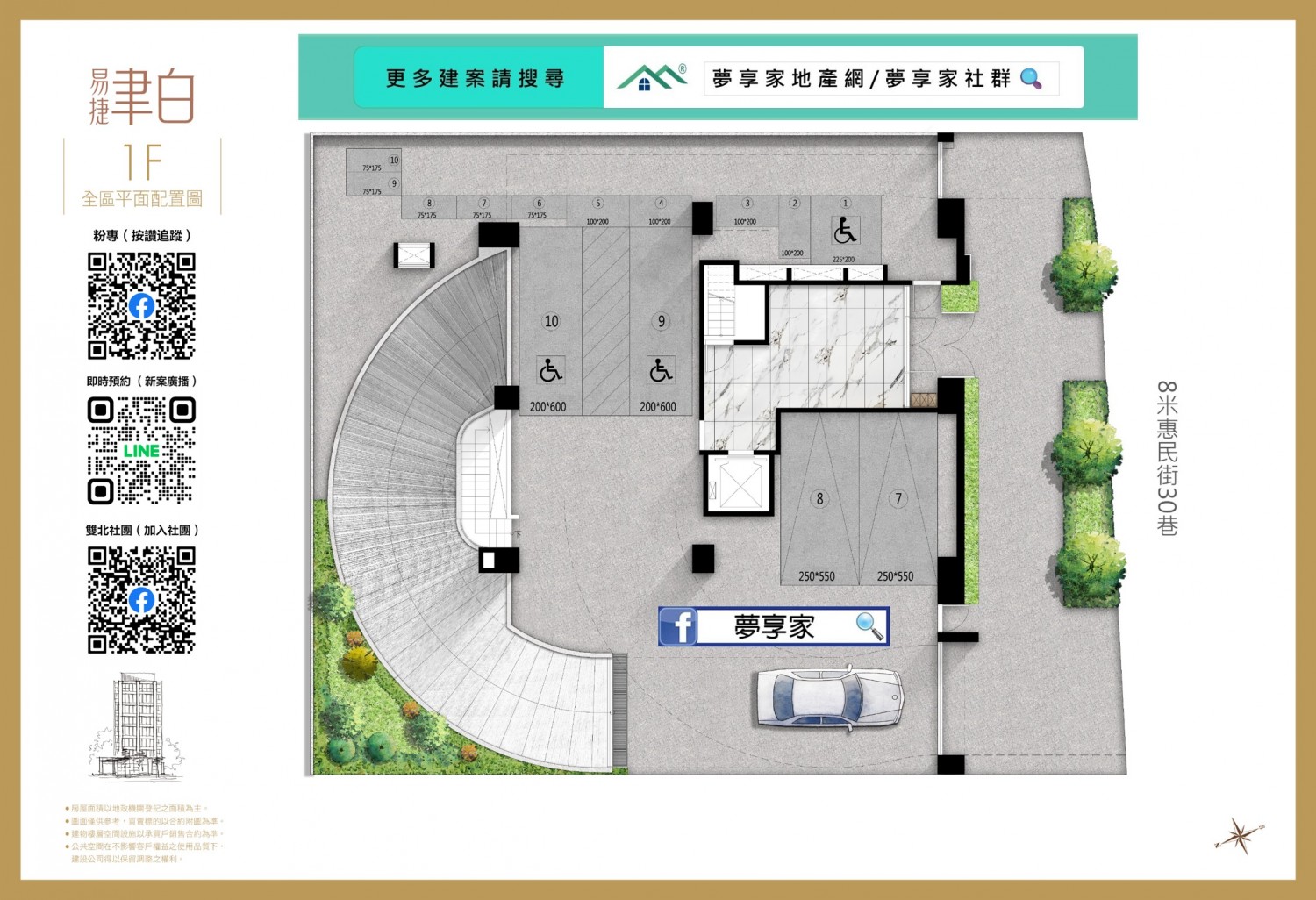 「易捷聿白」以”回到建築初心”為概念,在156坪微型基地上,展現純粹的建築美學與居住價值。單純七樓24席15&18坪1~2房樓高3米6,讓光與風自由流動;頂級進口建材選品,品味盡藏細節,並以此品牌首作榮獲國際四大獎項。基地位於新北市林口區惠民街30巷25號旁。