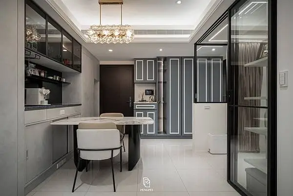 more「聯上匯翠」32坪三房新古典風裝潢分享,匯翠32坪三房是現在年輕人最喜歡的格局,所有空間方方正正沒有走道浪費,二間雙人房在左右二側,互相不影響,次主臥旁有一間單人房空間,如果家裡人口不多,有進行客變這個步驟,多數家庭會把這個空間打開圈開放或是規劃為半開放書房空間~
