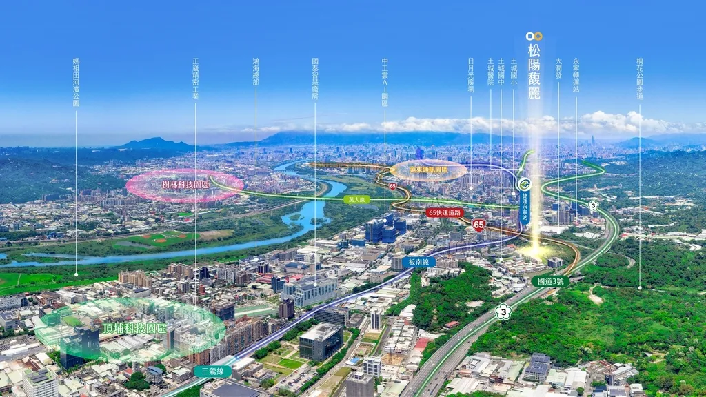 「松陽馥麗」轉個彎就能輕鬆上國道三號土城交流道 洽公旅行南下北上超便利 車行也能輕鬆上65快速道路 速達五股、泰山、板橋、新莊…等區域。