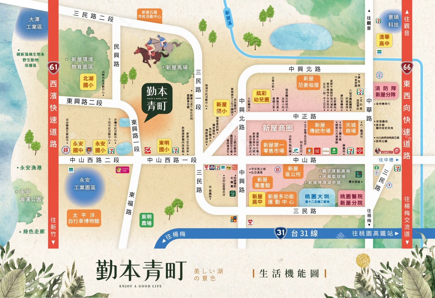 - 特色介紹 「勤本青町」位於桃園市新屋區東興路一段890巷11號旁,由勤本建設有限公司投資興建,嘉富營造有限公司營造,蕭詠如建築師事務所建築設計,