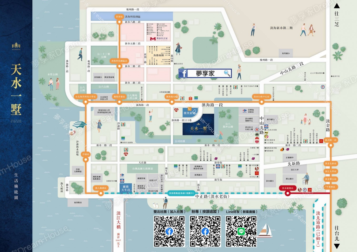 - 特色介紹 位於淡海新市鎮市中心的「天水一墅」,結合便利生活機能與優美自然環境,社區單一出入口、24 小時保全管理,確保住戶隱私、安全與生活品質。 住戶享有大面積的法式中庭花園與完善的公共設施,超值市區電梯別墅,限量典藏。3500坪中庭花園步道,步道採JW生態工法,透過特殊建築工法,回收雨水作為澆灌用途,達到節能省水作用,僅規劃122戶電梯別墅,獨享廣闊空間,主力採90~100坪獨門獨院電梯別墅,戶戶都擁有自在悠閒天地,通風、採光兼具,地下室則採雙車位車庫,尺度寬敞舒適。