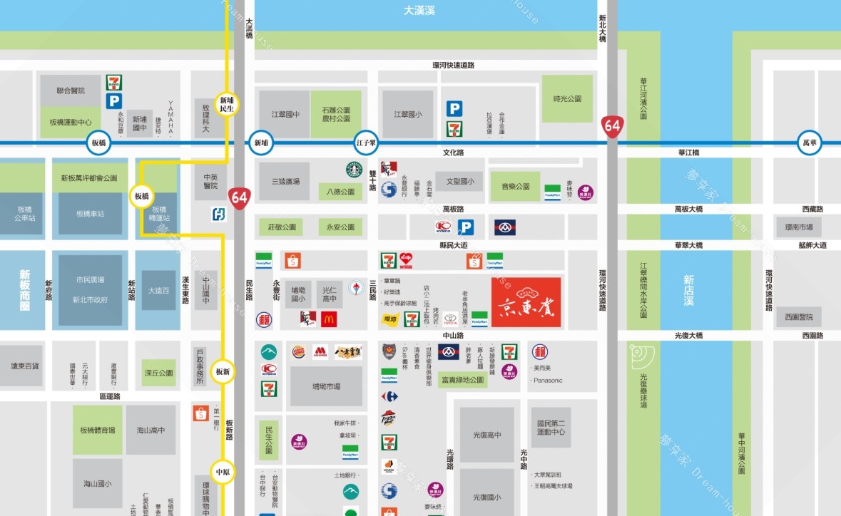 生活採買方面,車程約3分鐘可達全聯板橋中山店,距家樂福板橋店車程約5分鐘,車程約8分鐘可達板橋大遠百。