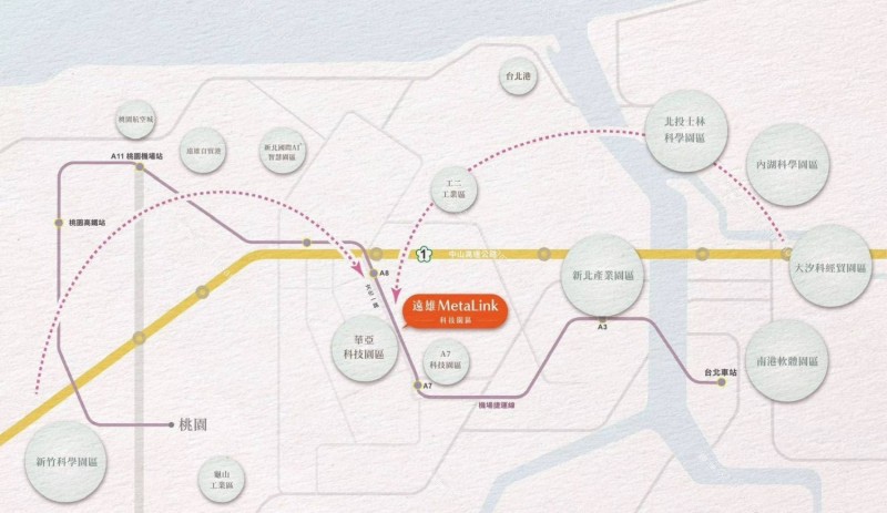 遠雄【MetaLink科技園區】,定錨AI金軸樞紐,對位華亞科,躍動於文化一路、機捷正門面,輕取國際能量核心,從研發到製造,從在地到國際,產業、交通、人才三軸匯聚,企業一站式戰略升級首選
