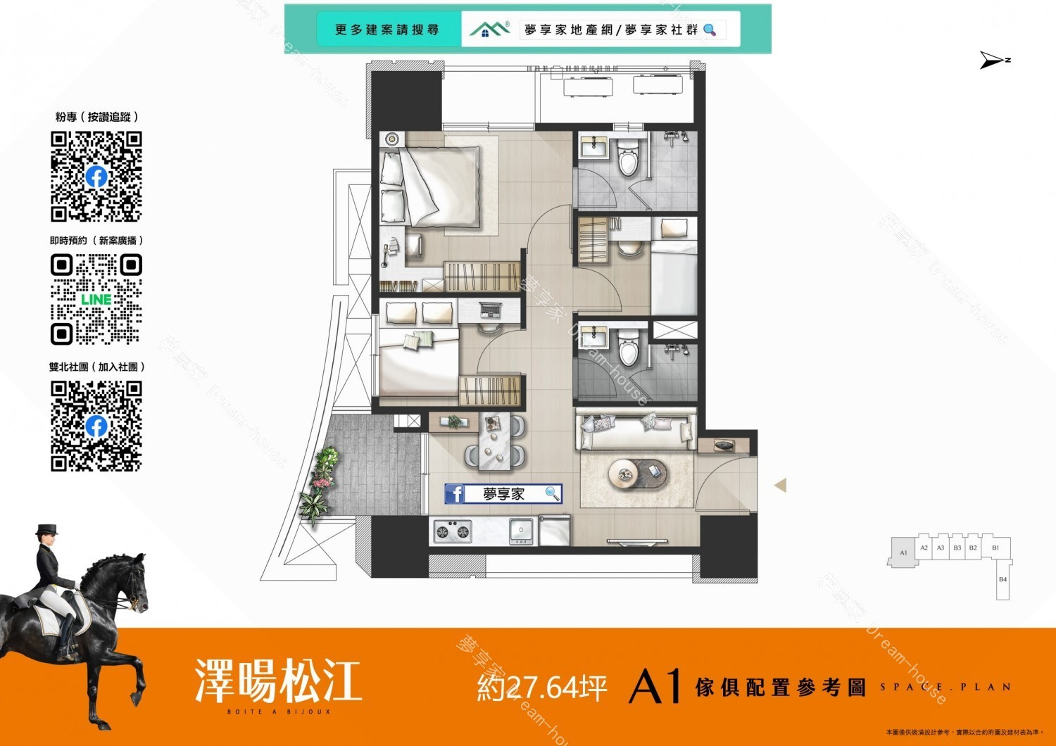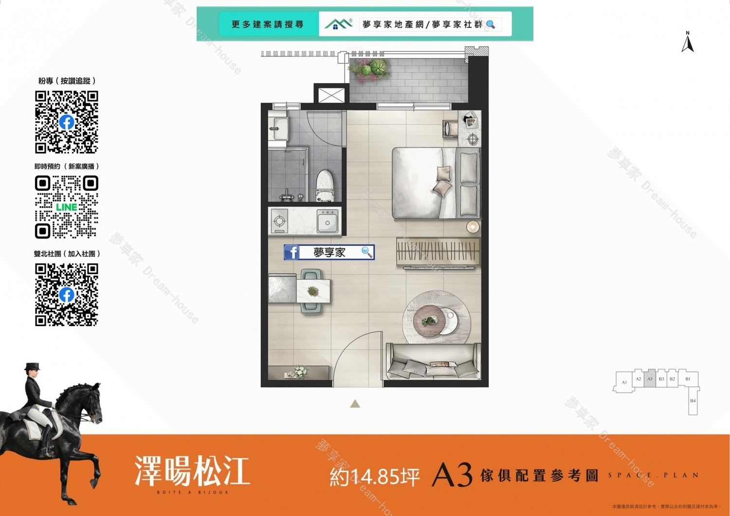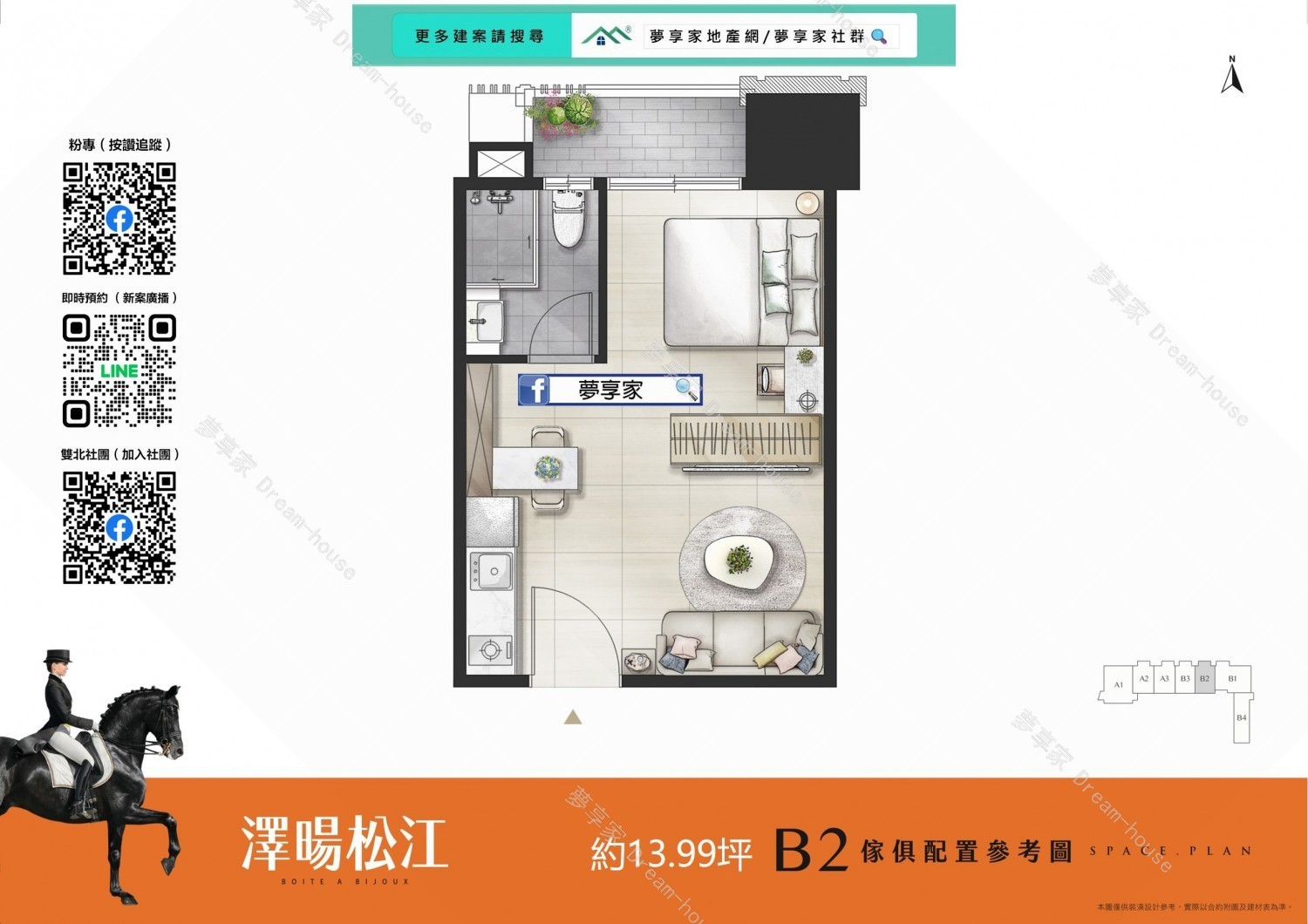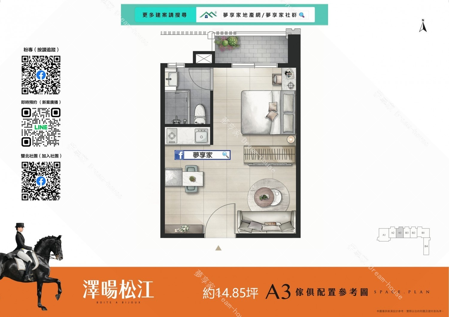 • 格局/坪數 約1房13~14坪 , 2房19~23坪 , 3房27坪