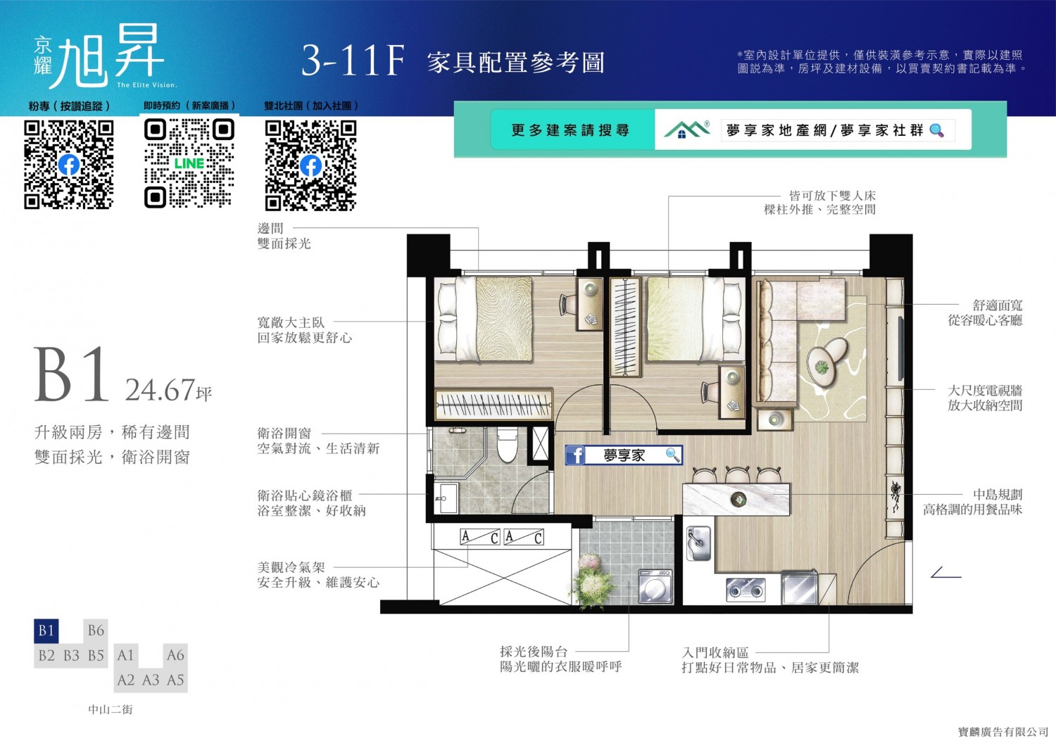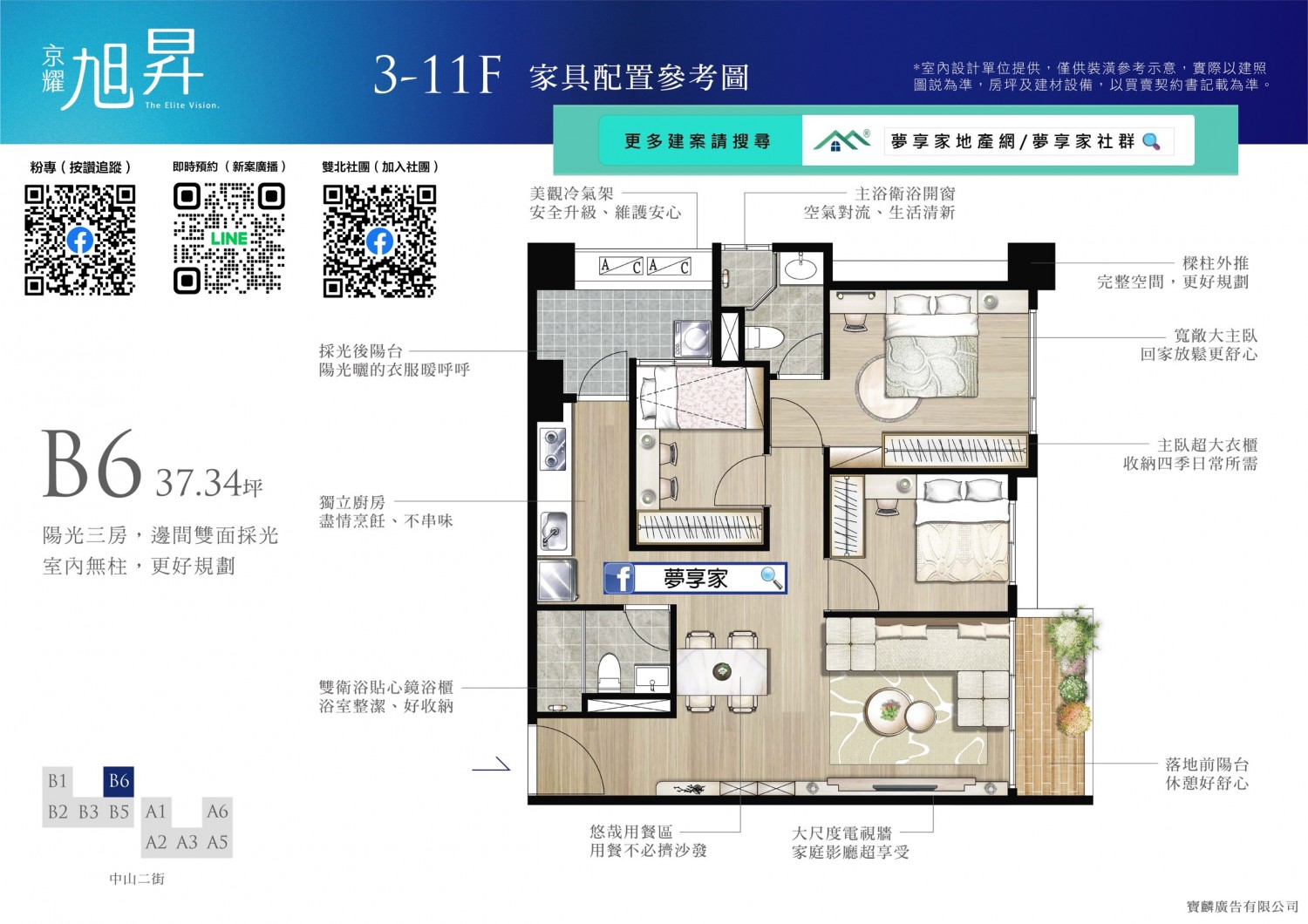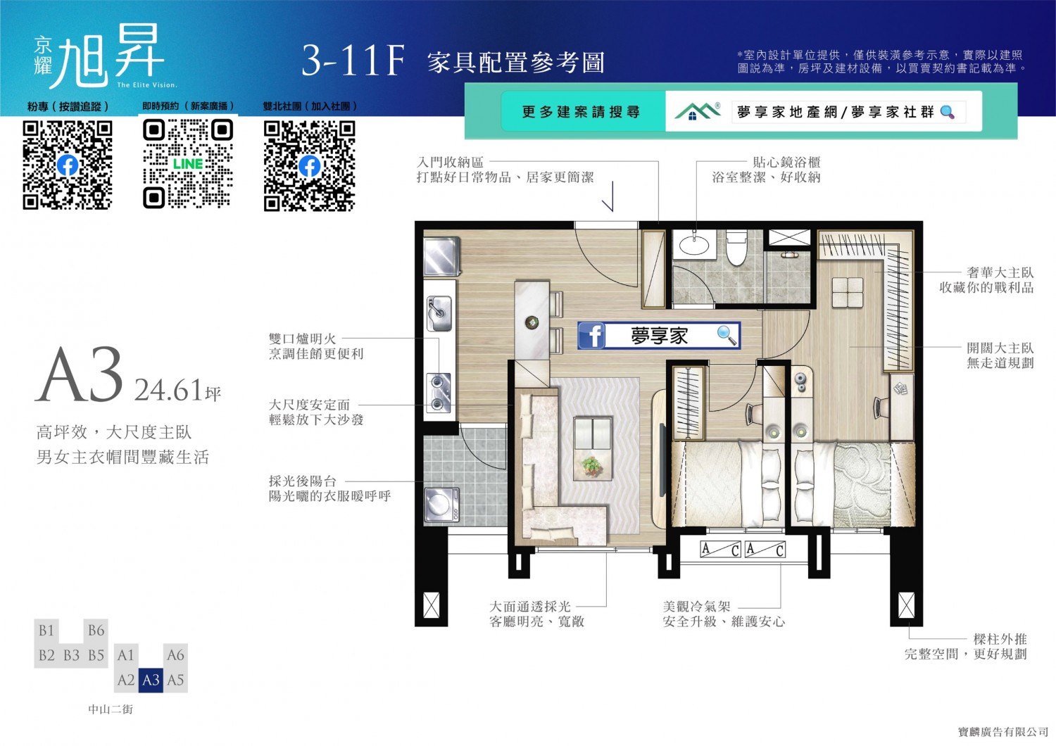 全案無暗廳暗房,前後大面積退縮,無論任何座向皆採光充足、通風良好。大3房更全數配置邊間,臥室柱子外推,空間更方正好用。2房僅36戶,主推大3房格局,適合重視空間感的剛需買家與換屋族。