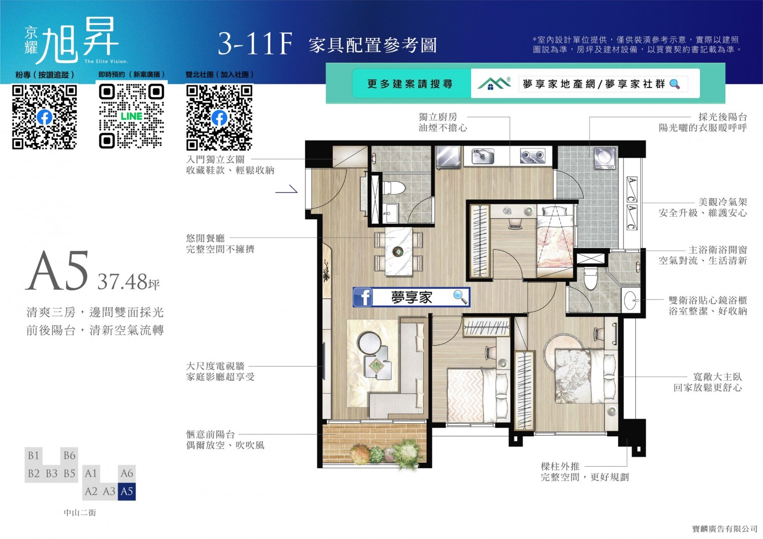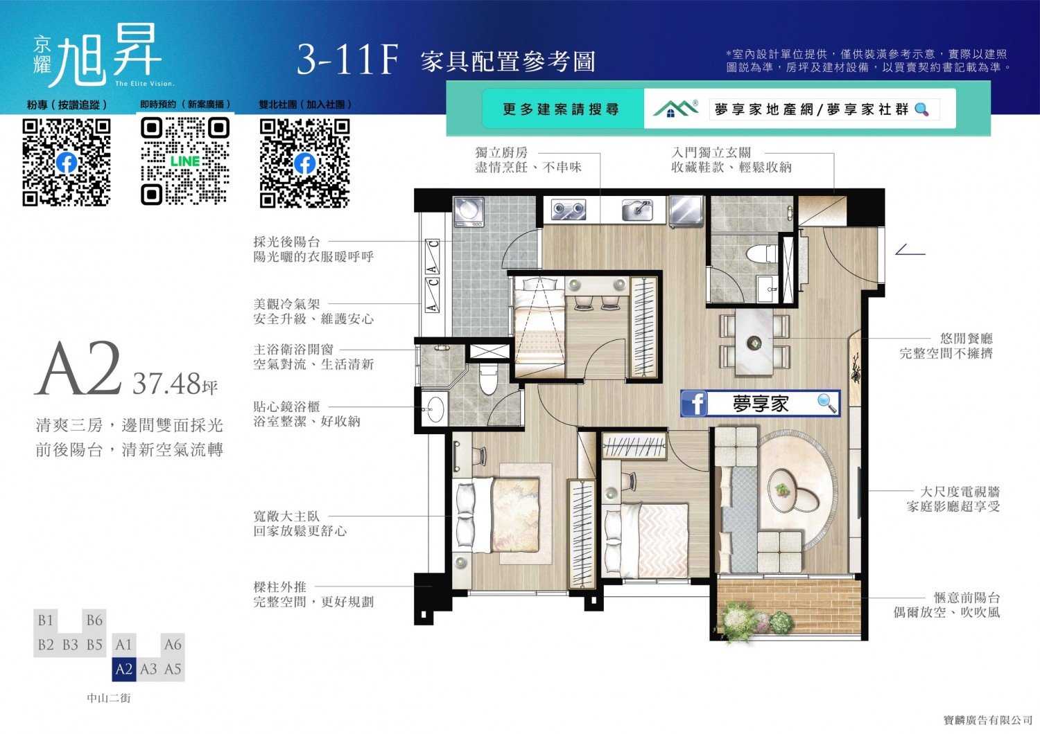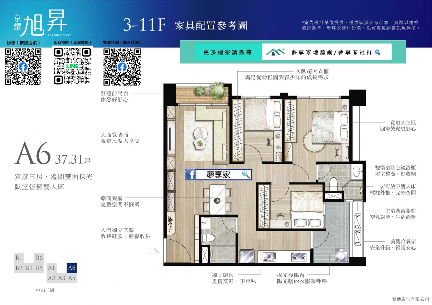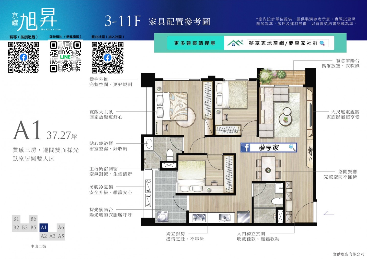 全案無暗廳暗房,前後大面積退縮,無論任何座向皆採光充足、通風良好。大3房更全數配置邊間,臥室柱子外推,空間更方正好用。2房僅36戶,主推大3房格局,適合重視空間感的剛需買家與換屋族。