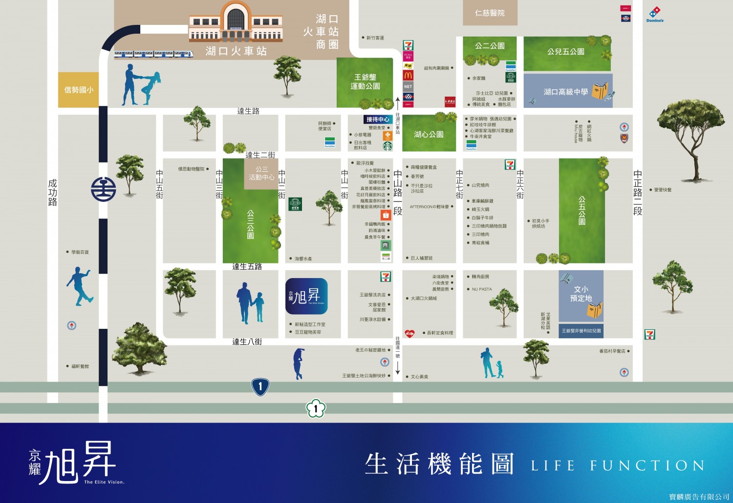 湖口車站車程約4分鐘,國道一號串聯大新竹各地。全聯福利中心2分鐘可達,寶雅4分鐘、湖口市場5分鐘,麥當勞、星巴克、全家等連鎖商家盡在周邊,下樓步行皆5-7分鐘,日常所需不出重劃區即可一次搞定。