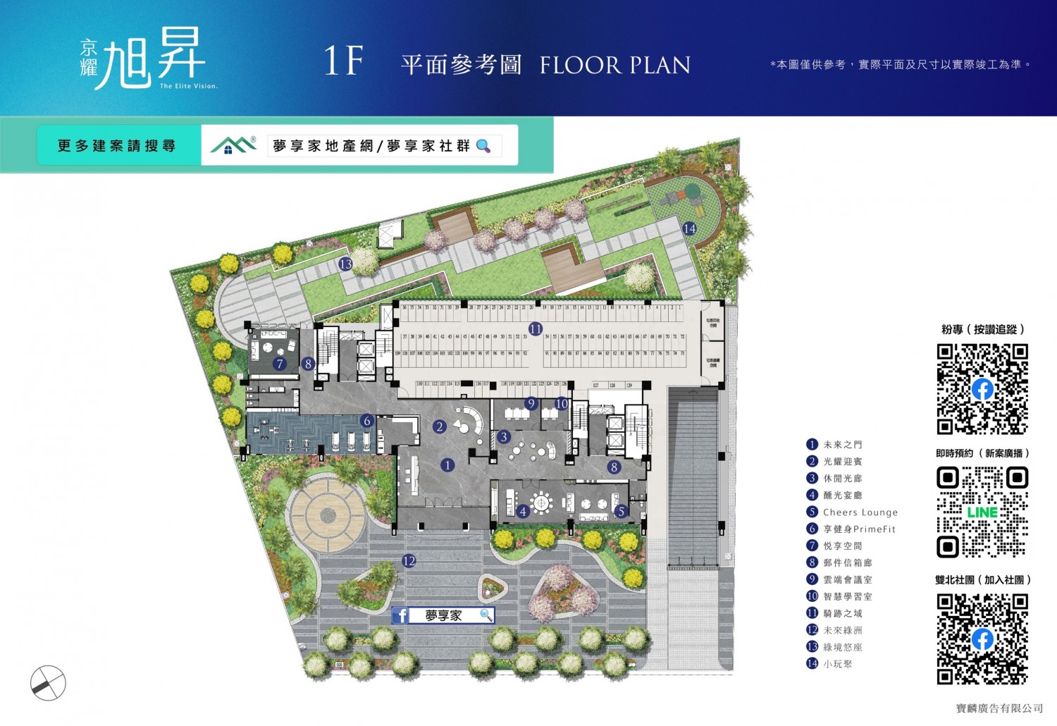 涵蓋迎賓綠廊、接待大廳、中庭花園、交誼廳、雲端會議室、智能學習室、全方位健身房、KTV影音室、廚藝教室及Lounge Bar,讓每一天回家都像度假,即使不出門也能盡享生活樂趣。