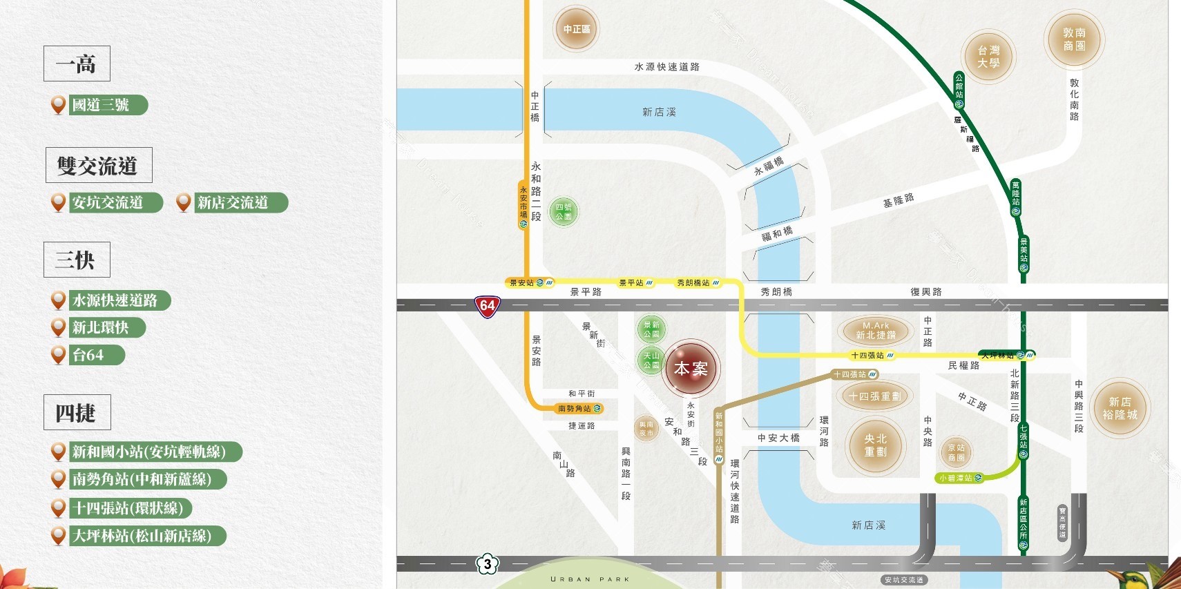 3、交通便捷四通八達、一高(北二高)三快(水源快、新北環快、64快)雙交流道(安康交流道、 新店交流道)六橋:秀朗橋、中安大橋....